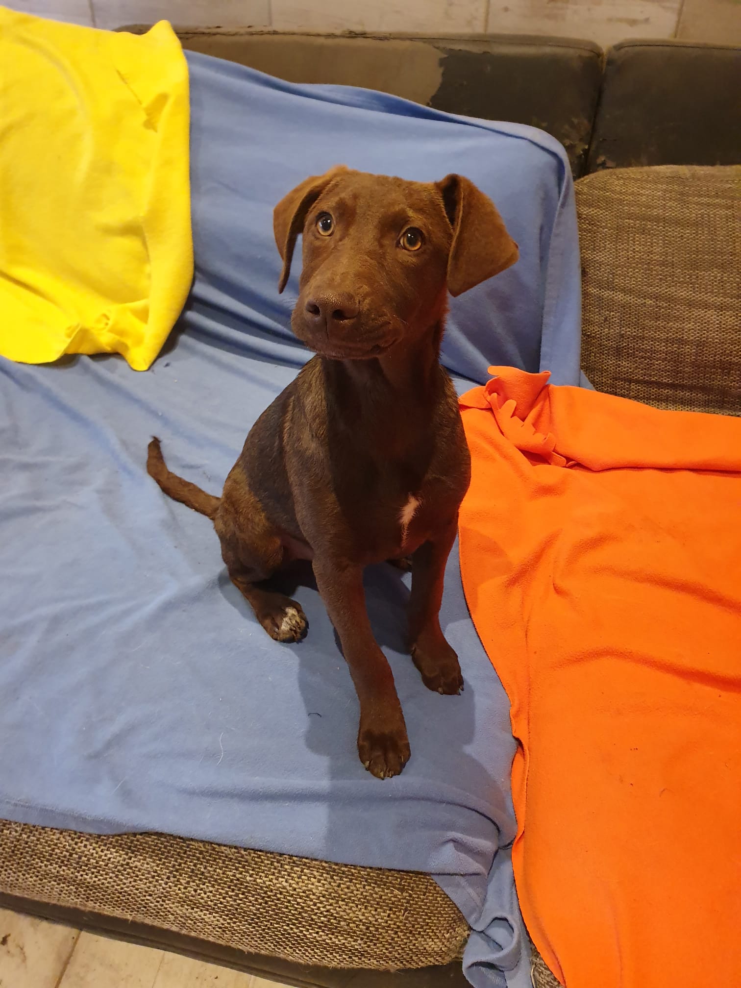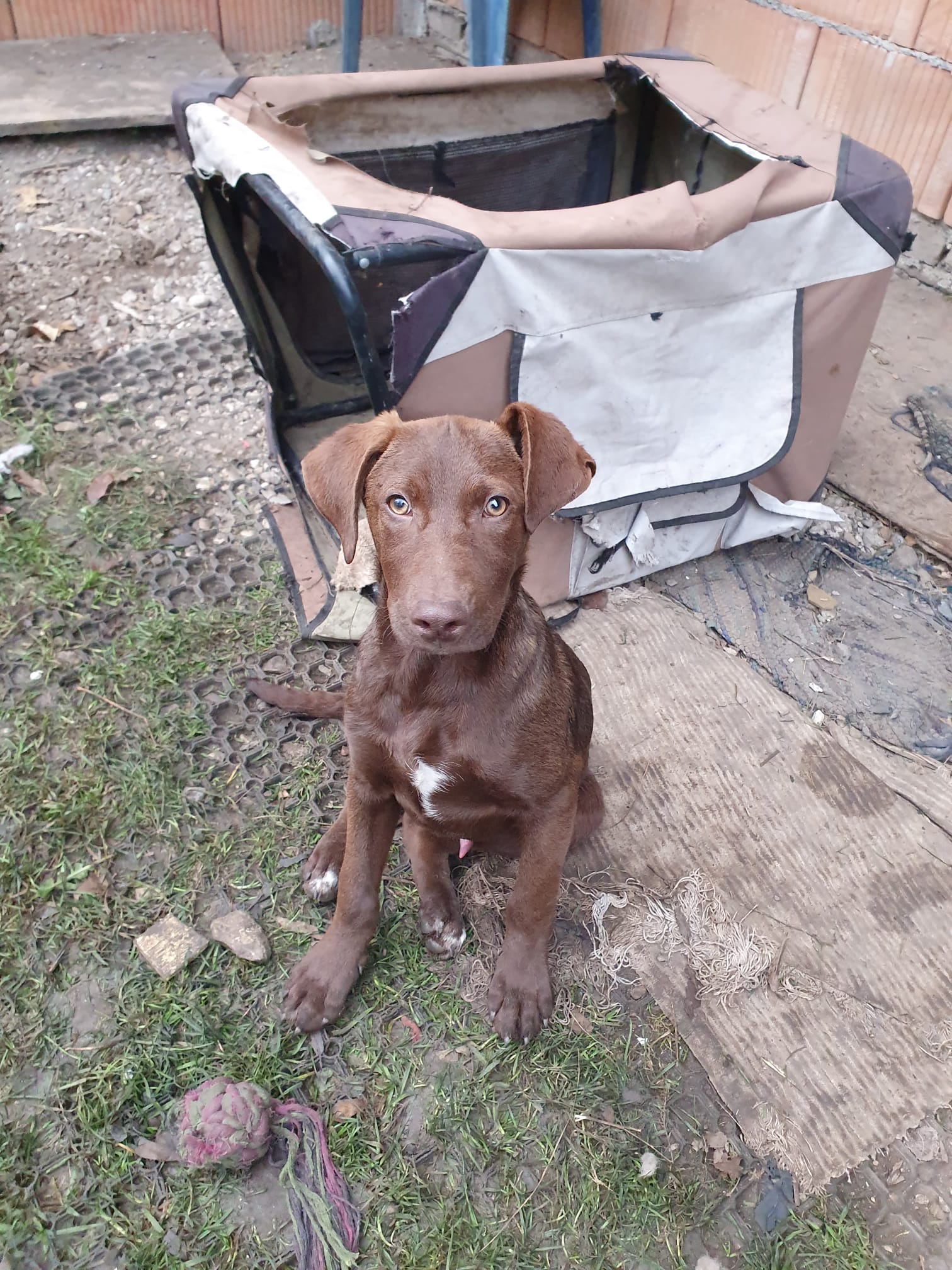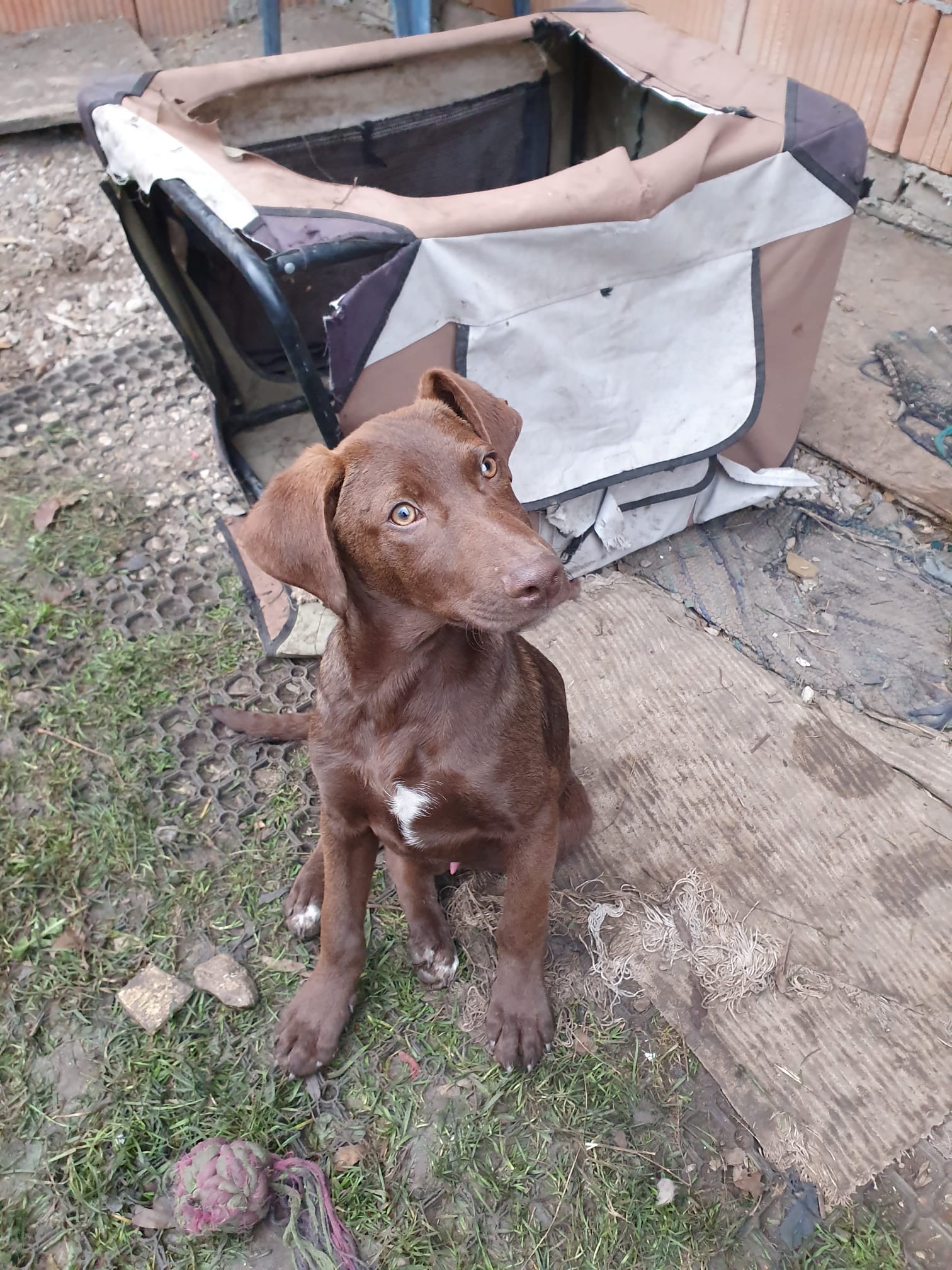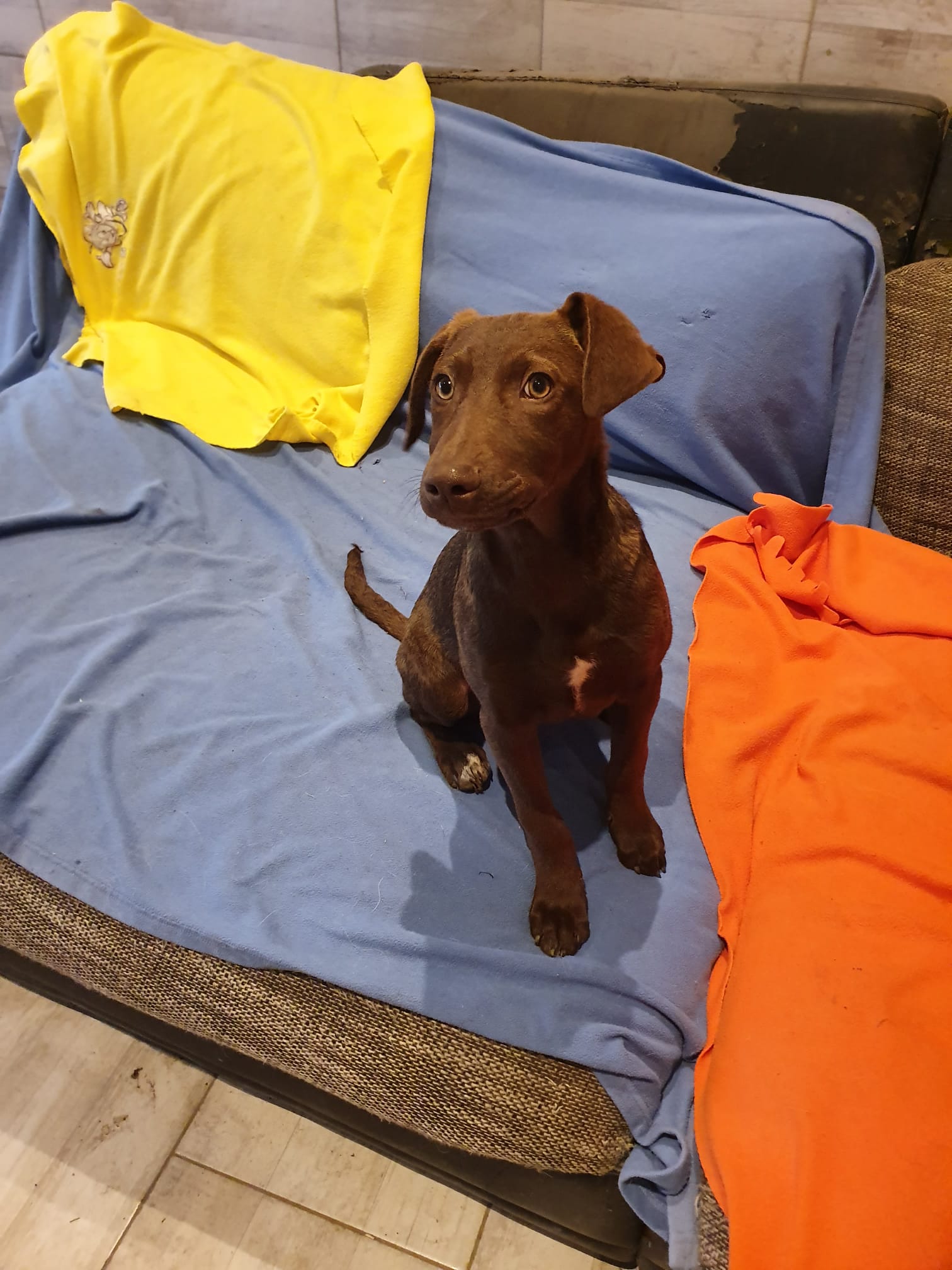 Der Rüde stammt aus einer Rettungsaktion und lebt aktuell mit seinen Geschwistern zusammen. Er geht freundlich auf Menschen zu, zeigt Nähebereitschaft und verträgt sich gut mit anderen Hunden. Er wirkt ausgeglichen, neugierig und entwickelt sich zu einer mittelgroßen bis größeren Schulterhöhe von etwa 50 cm.