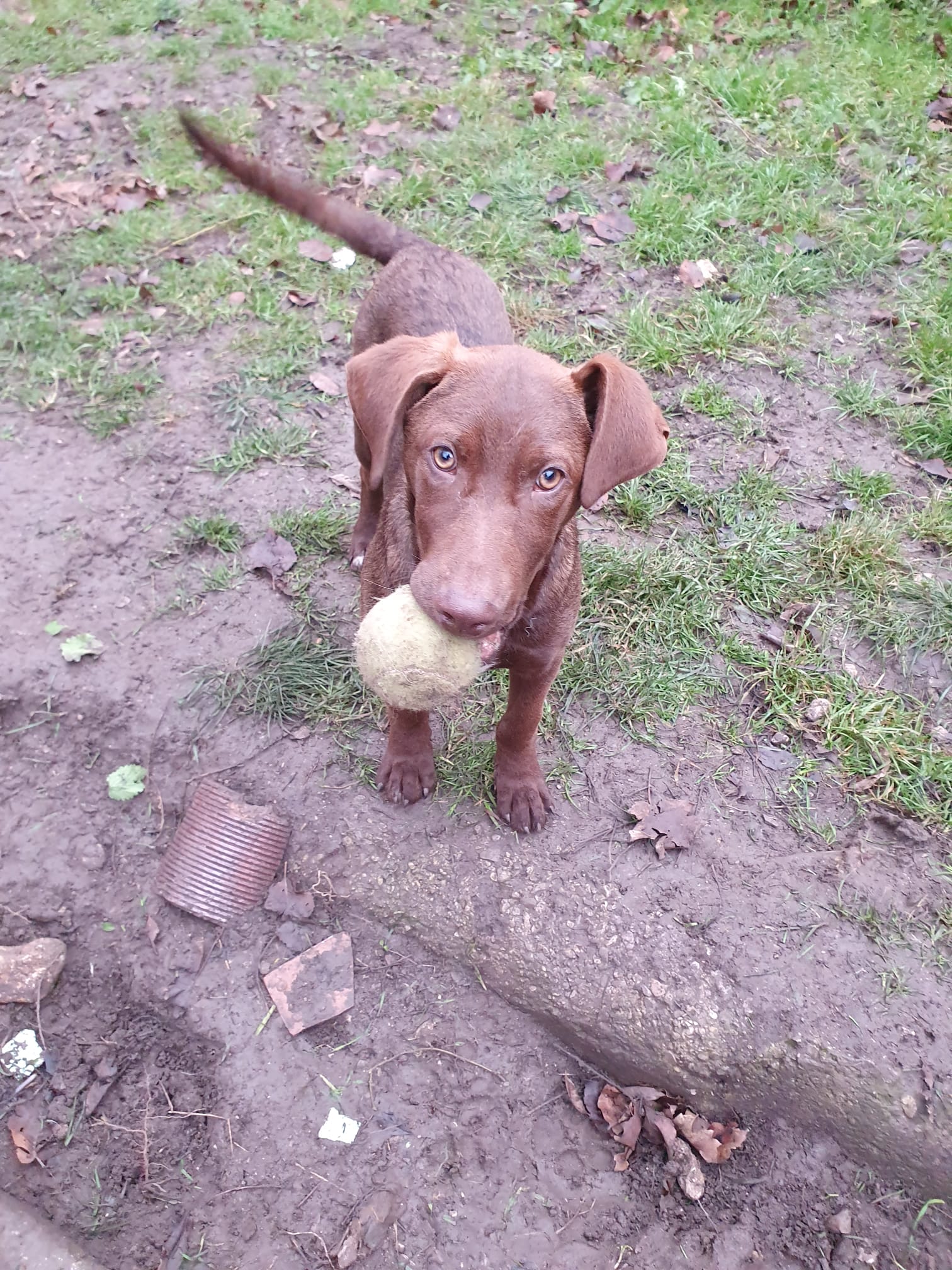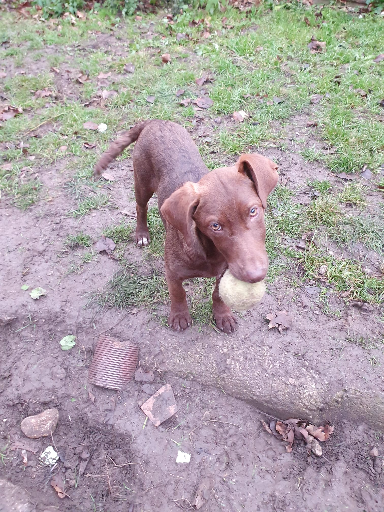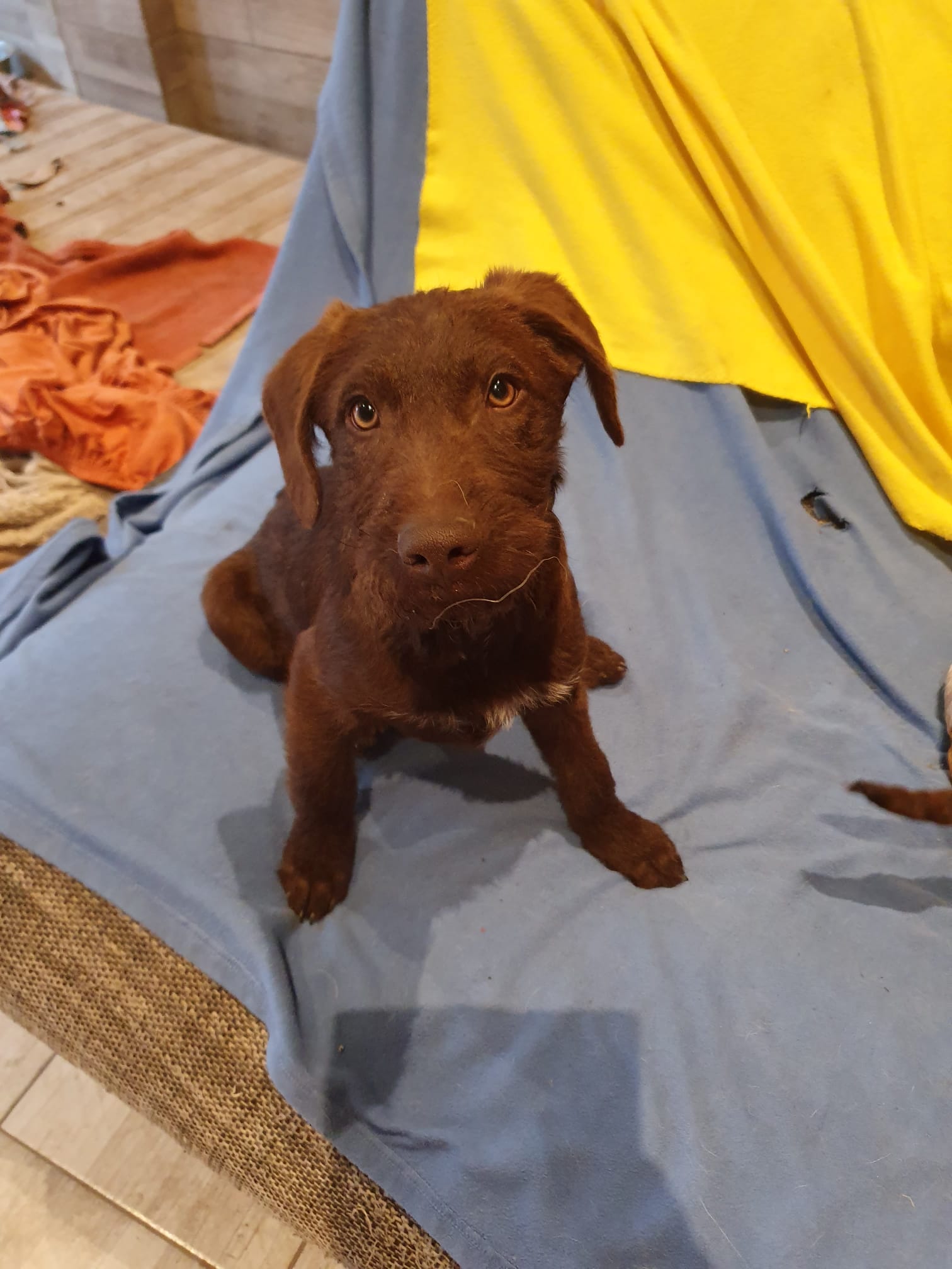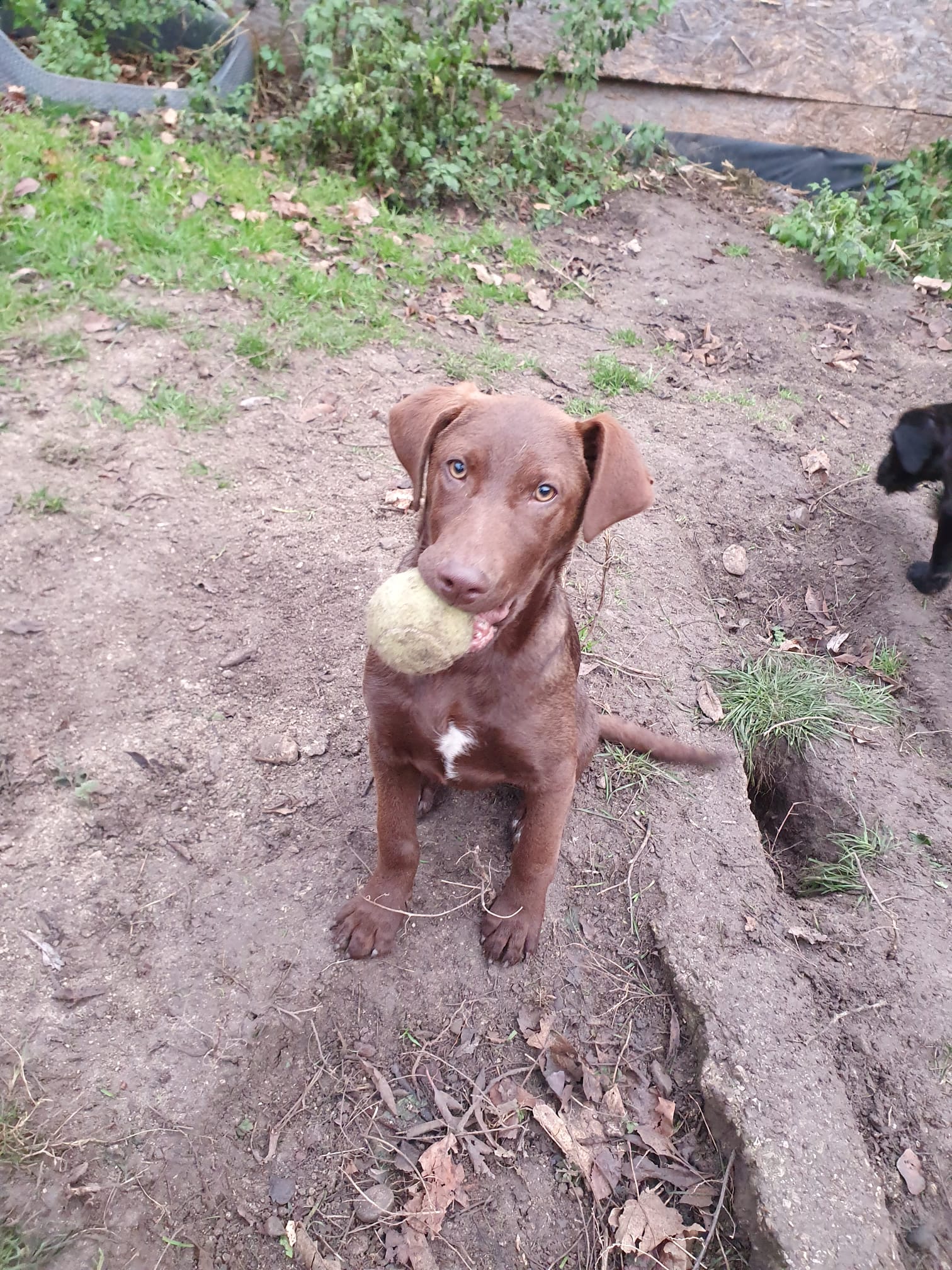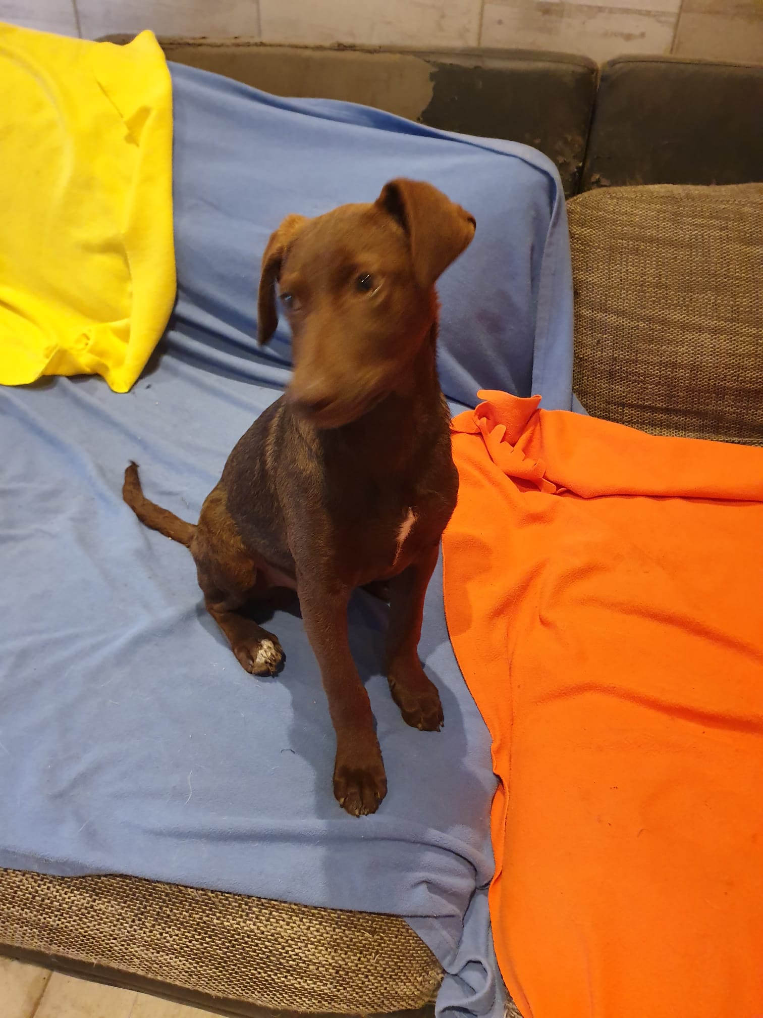 Der Rüde stammt aus einer Rettungsaktion und lebt aktuell mit seinen Geschwistern zusammen. Er geht freundlich auf Menschen zu, zeigt Nähebereitschaft und verträgt sich gut mit anderen Hunden. Er wirkt ausgeglichen, neugierig und entwickelt sich zu einer mittelgroßen bis größeren Schulterhöhe von etwa 50 cm.