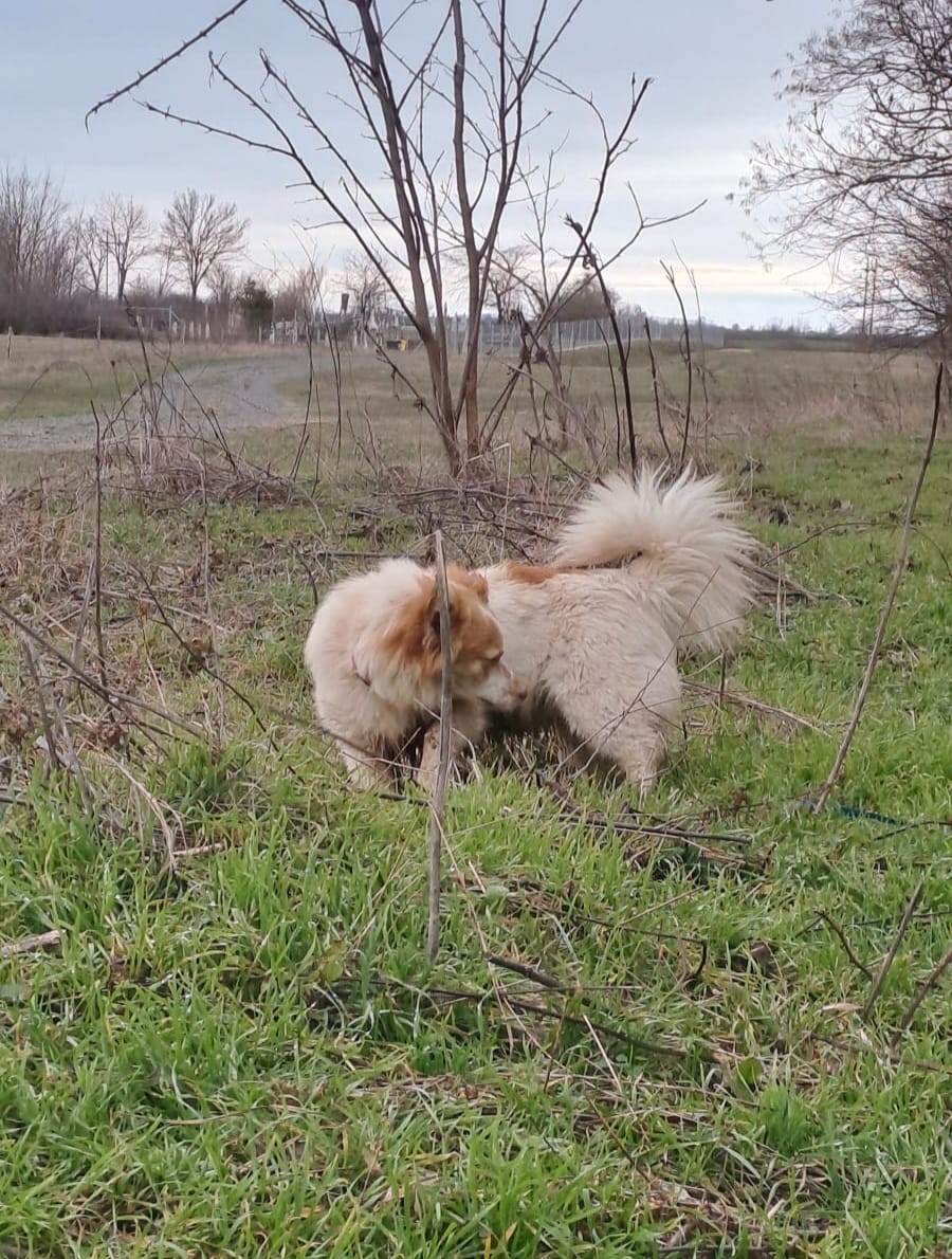 DER HUNDE IST SEHR FREUNDLICH ZU MENSCHEN UND HUNDEN, KATZEN ; GEHT GUT AN DER LEINE